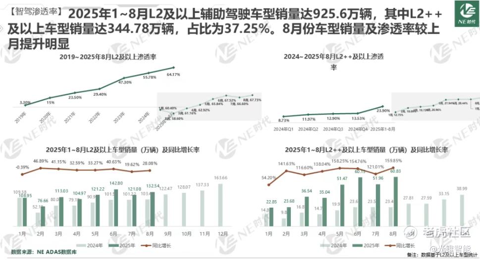 从技术视角看,智驾在2025年已经实现初步普及。根据NE时代统计数据显示,2025年1~8月L2及以上辅助驾驶车型销量累计达925.6万辆,渗透率达64.17%,其中L2++及以上车型销量累计达344.78万辆,占L2及以上辅助驾驶车型总量的37.25%。