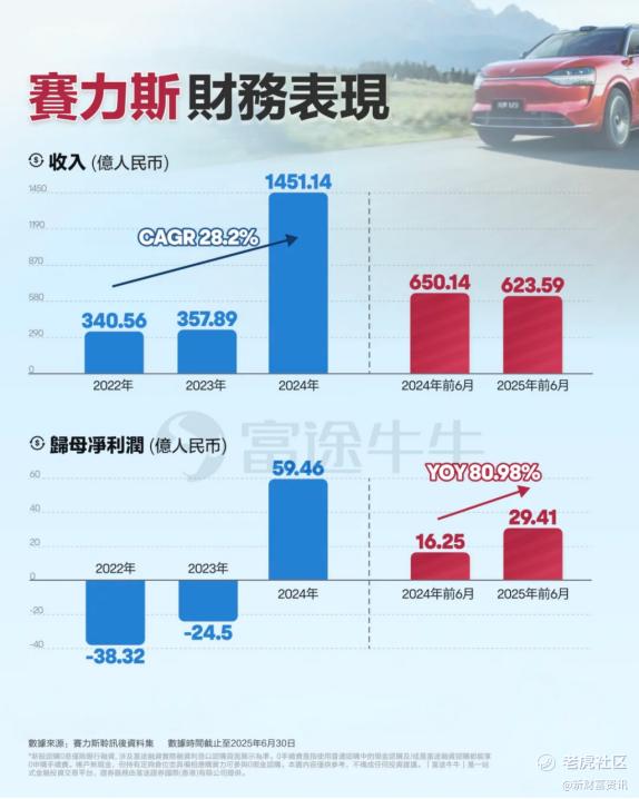 赛力斯2025年上半年财务数据呈现“营收微降、利润大增”的显著特征,折射出高端化战略的阶段性成效。营收端,上半年实现营业收入623.59亿元,同比下降4.08%,主因汽车销量同比下滑15.77%至19.86万辆,一季度改款与新品等待期拖累了销量表现。