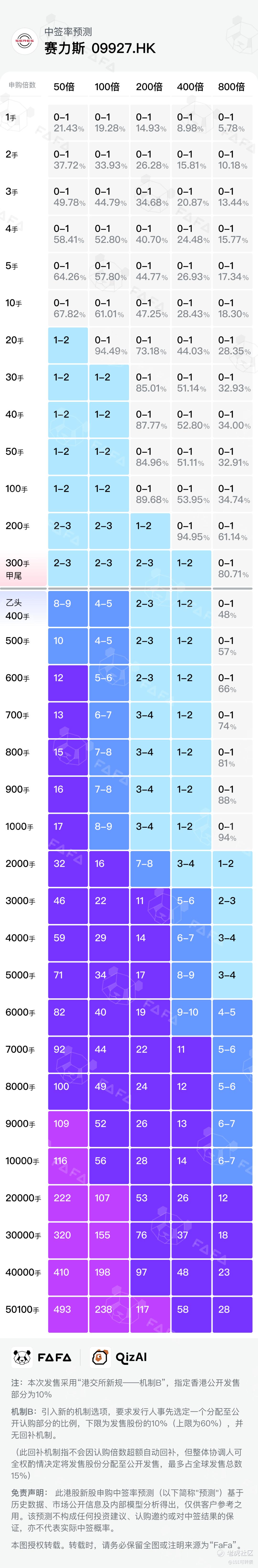赛力斯,本次采用B机制公开发售,回拨10%;全球发售1.00亿股,香港公开发售占10%,即1000万股,一手是100股,甲乙组共计10万手,中签率比剑桥科技还要低一些,剑桥科技是13.4万手,160手稳1手,所以赛力斯预计200手以上才能稳1手了,现在热度不高,目前按照时间线来看,富途,老虎这些早出结果的券商,赛力斯跟明略科技-W,是不冲突的,明略科技-W是30号下午出结果,赛力斯是31号上午9点截止(不同券商截止时间不一样,以券商截止为主);资金释放后,预计是500倍的热度。甲尾与乙头申购所需本金分别是40万和53万,从剑桥科技的中签率来看,乙头比甲尾更有优势,不过赛力斯中签数应该是差不多的;
