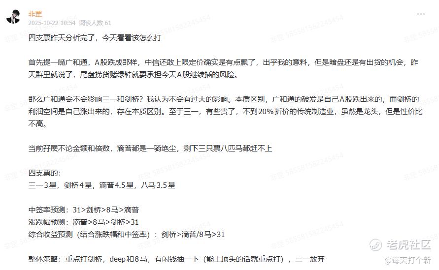 最重要的是,公司周五凌晨发布三季报,这就带来很大的不确定性。因此我的策略也明确,周五早上看财报、孖展、以及这两天A股走势决定是否申购。