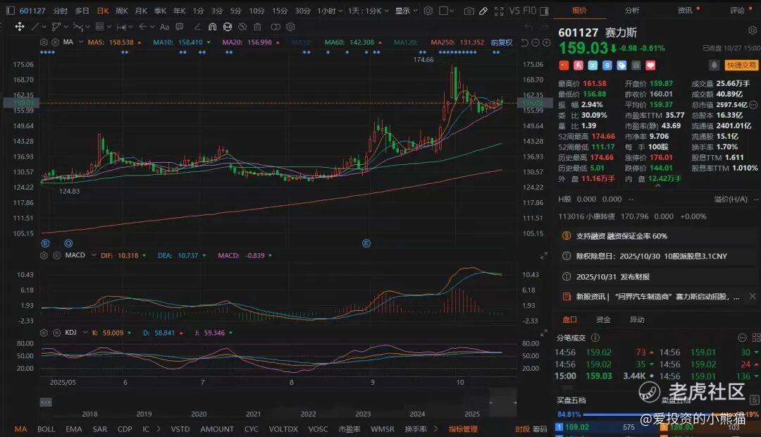 截至2025年10月27日,赛力斯A股收盘价为人民币159.03元,港股最高发售价定为131.50港元(约合人民币120.98元),A股较H股溢价率达31.45%。这一溢价水平处于新能源车企A+H股的合理区间(比亚迪约10%-15%,理想汽车约8%-12%),但显著高于行业平均,主要反映A股投资者对“**生态第一股”的估值溢价 。
