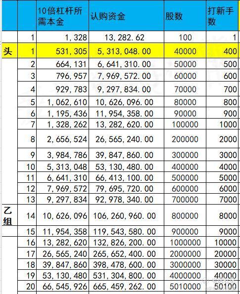 乙头需要认购资金532万,乙组的各档融资所需要的本金还有融资金额对应如下表: