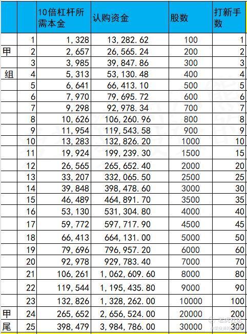 甲组的各档融资所需要的本金还有融资金额对应如下表: