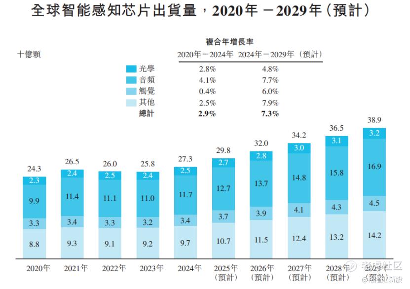 根据灼识咨询,2024年智能感知芯片全球出货量达到273亿颗,并预期到2029年会增长至389亿颗,2024年至2029年的复合年增长率为7.3%,原因为新兴智能设备的普及和消费者对感知能力越来越高的需求。