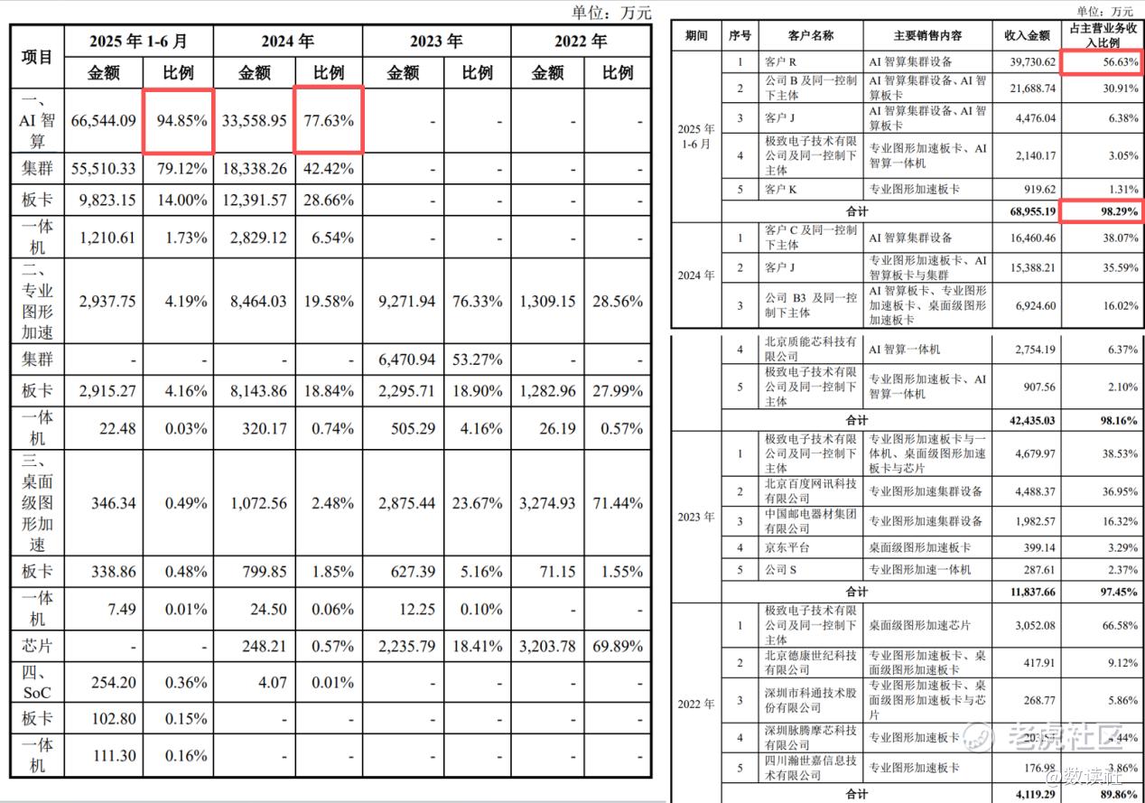 大客户依赖度较高,并且集中度是一直在加深。上半年,摩尔线程前5大客户贡献营收98.29%,其中第一大客户贡献56.63%,半壁江山靠一家客户维系。今年1-3月,沐曦股份前五大客户占比达到88%。