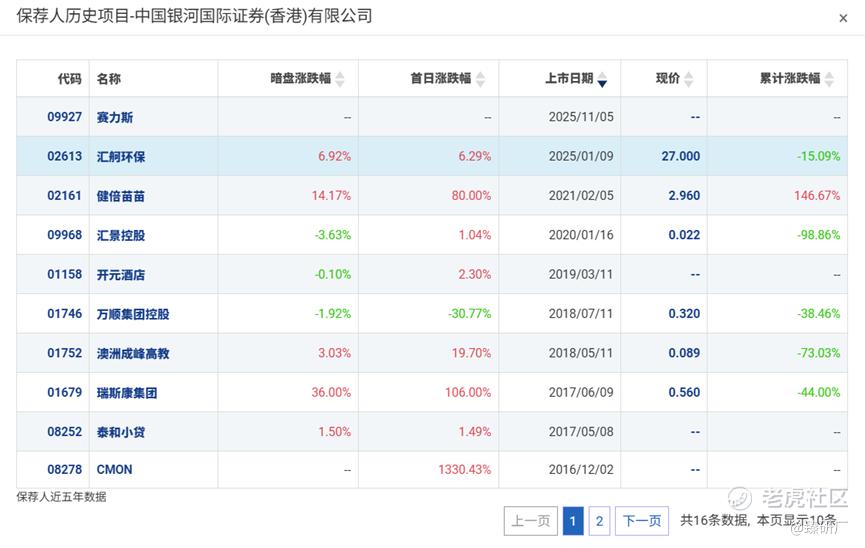 中国银河国际历史上作为保荐人参与了14个项目,其中暗盘有8家公司上涨,3家公司下跌,3家公司平盘,破发率21.43%。首日有13家公司上涨,1家公司下跌,0家公司平盘,破发率7.14%,整体胜率很高。但是近两年以来仅参与保荐了1个项目,因此历史数据的参考价值有限。