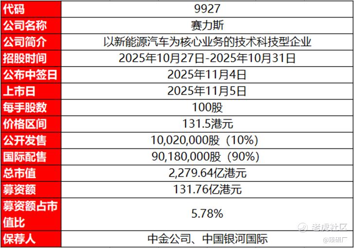 本次采取机制B发行,公配固定10%,共13.2亿货10万手,以公司的体量来说整体货量不多。近期赛力斯A股股价在10月初冲高后进入回落期,因此AH股折价回跌至约25%,安全边际不能说充足。此外,上周A+H的广和通破发打破了机制B不败金身,叠加三一重工暗盘破发可能会在情绪上有不利影响。但是以外资为首的港股市场通常更青睐龙头,例如宁德时代甚至出现AH股折价倒挂,介于问界在**生态中的绝对领先地位,赛力斯作为在国内高端新能源汽车市场排名第三的龙头企业,估值仍然有一定的上探空间,感兴趣的投资者可以持续关注后续几天认购情况。