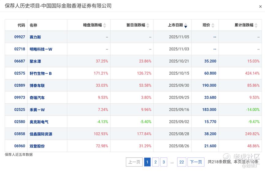 中金公司历史上作为保荐人参与了214个项目,其中暗盘有96家公司上涨,92家公司下跌,26家公司平盘,破发率42.99%。首日有102家公司上涨,82家公司下跌,30家公司平盘,破发率38.32%,整体胜率一般。今年以来参与保荐了26个项目,其中有9家公司暗盘或首日破发,有6家公司录得累计跌幅,体现中金近一年来参与保荐的项目素质较过往明显提高,但是由于保荐能力一般,使得暗盘和首日胜率一般,不过7月以来的大项目几乎都有较大的涨幅,近期表现不错。