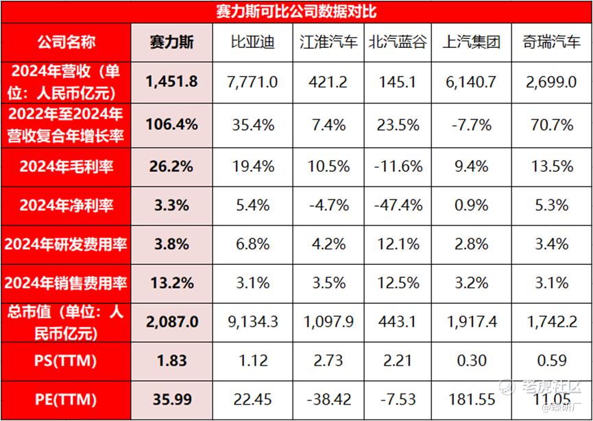 本文选取比亚迪、江淮汽车、北汽蓝谷、上汽集团、奇瑞汽车作为赛力斯的可比公司。