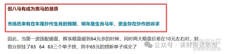 其强力拉升原因,无论在打新私蜜圈或者昨天公号上的文章都已经说过了:市场历来有在年尾炒作生肖的预期,明年是生肖马年,资金存在炒作的诉求