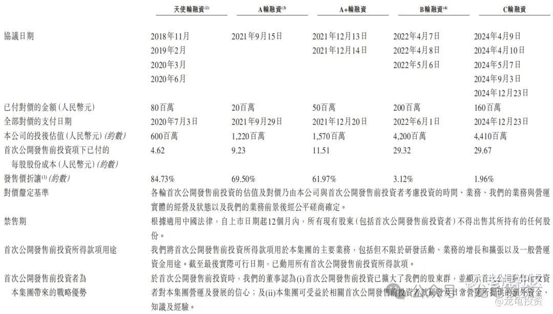 公司IPO前完成五轮融资,最后C轮融资每股成本29.67元人民币,约合32.46港元,投资后估值44.1亿人民币,约合48.25亿港元,较发售价折让1.96%;本次未设基石投资者;保荐人由中信证券独家保荐,稳价人由中信里昂担任。