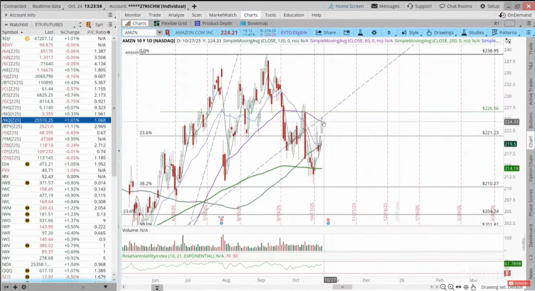 他提醒,亚马逊的底部支撑在210美元一线,财报预期为营收增长11%。若财报兑现但股价仍下跌,则是非理性回调;若能放量突破225美元,将确认右侧趋势的启动。他本人目前持有100股,平均成本约210美元,已提前减仓控制风险。他笑称:“现在拿着一把白骨在等,看运气能不能突破成功。”