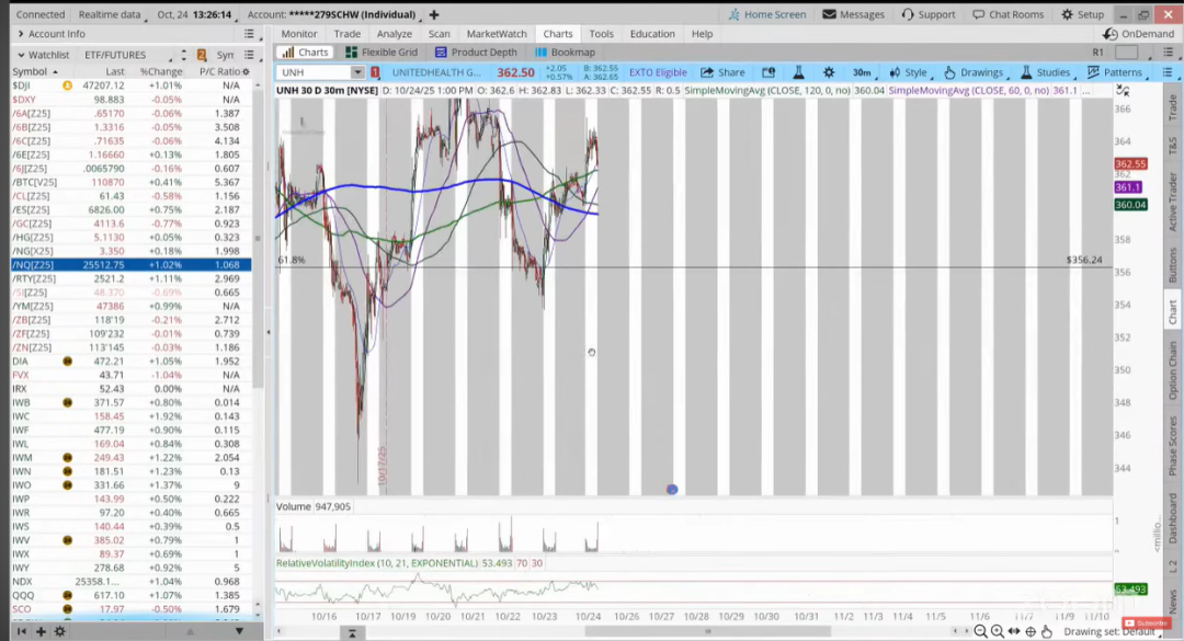 周五UNH小幅上涨,但表现不及预期。Jackson老师指出,当前UNH仍未突破关键区间,财报预期较弱,唯一的好处是下方支撑明确。若财报不佳但跌幅控制在3%以内,仍属合理范围;若意外跌破340美元底部,则可能触发较深调整,目标价或看向334美元。