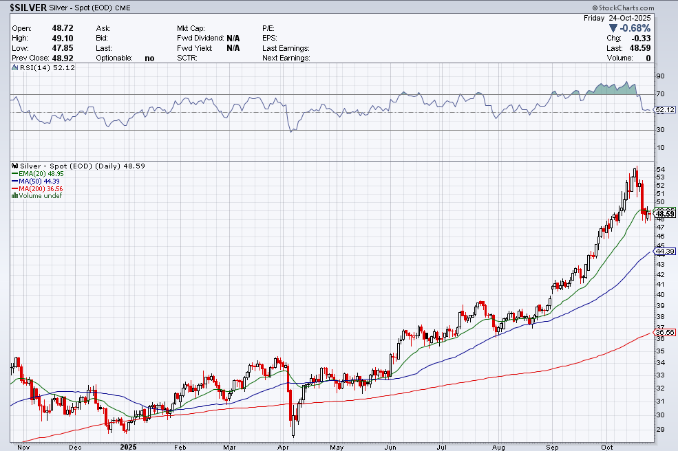 从技术面看,白银在10月创出高点后出现调整,但仍稳稳运行50日均线上方。短线或有震荡,但中长期仍具上行动能。