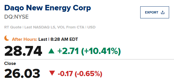 Daqo New Energy(DQ)第三季度每股收益为0.05美元,比市场预期值每股亏损(0.59美元)高出0.64美元;营收同比增长23.2%至2.446亿美元,市场预期值1.768亿美元。