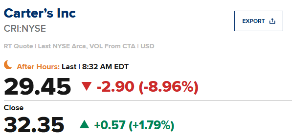 Carter's (CRI)第三季度每股收益为0.74美元,比市场预期值0.73美元高出0.01美元;营收同比下降0.1%至7.578亿美元,市场预期值7.7231亿美元。