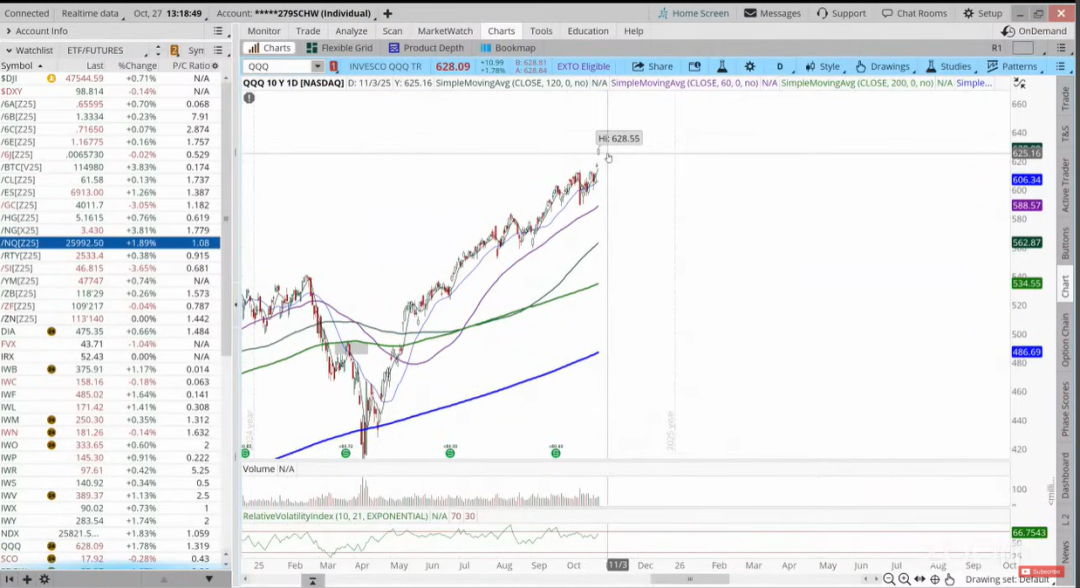QQQ周一连续跳空上涨,收盘强势。本周周期以做多为主,压力位看632–634,支撑位在622–624。周三期权结算区间约12点,即便回调也难以跌破615。月线级别预计收阳,不建议逆势开空。