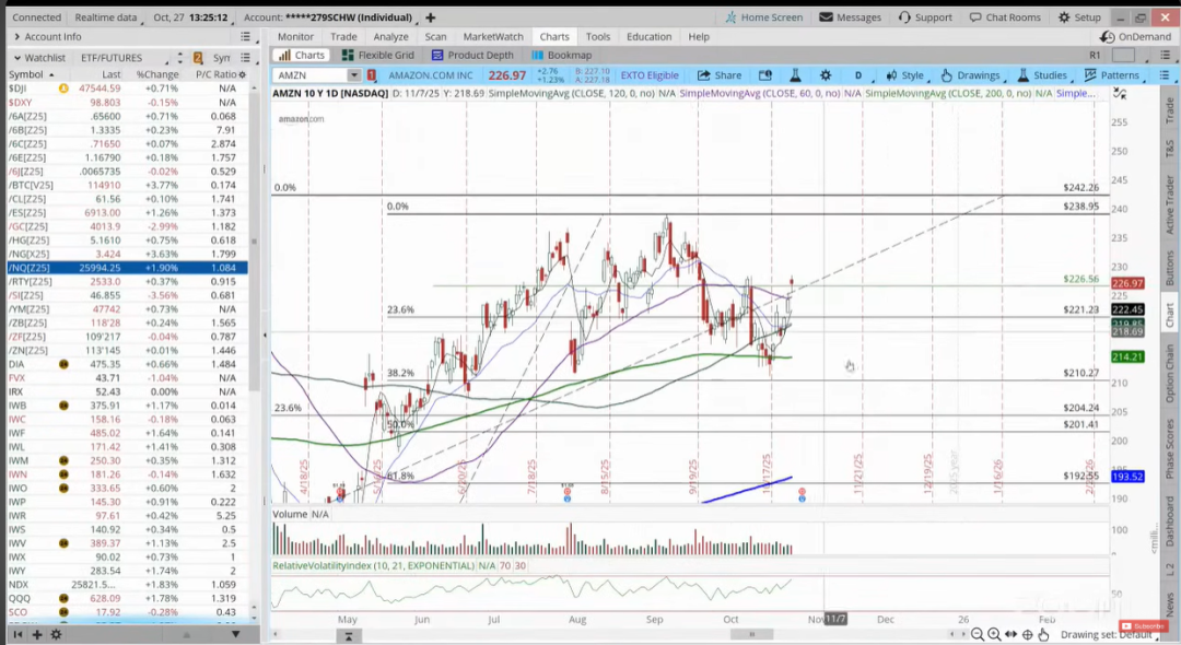 亚马逊周一盘中传出裁员消息引发跳水,但整体结构仍乐观。股价在235–200大区间内震荡,底部形态初步成型。操作上采取高抛低吸,周一在226–227区域止盈股票,后续计划通过卖出看跌期权(如250行权价、约33权利金)锁定接货成本在217左右,以时间换空间。