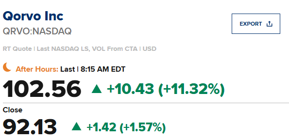 The Information报道,Skyworks(SWKS)据悉洽谈以80亿美元收购竞争对手Qorvo(QRVO)。Qorvo上调了第二季度业绩指引,预计每股收益为2.22美元,而之前的指引为2.00美元,+/- 0.25美元,市场预期值2.04美元;预计第二季度营业收入10.59亿美元,而此前的预期为10.25亿美元,+/- 5000万美元,市场预期值10.3亿美元。