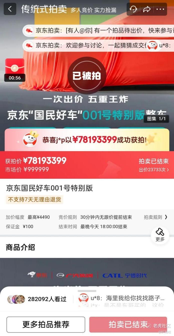 10月14日京东才官宣造车,仅仅8天后京东就玩了把“京东汽车首车的001特别版”的竞拍,一万元起拍,在短短的4个小时的时间内,京东首车被拍到7819万元的天价。总竞价次数达23733次,在240分钟内,每分钟竞拍出价近百次,创下了1万元起拍最终成交价的记录,其中竞标次数同样创下记录。