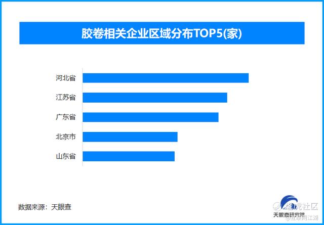 天眼查专业版数据显示,截至目前我国现存在业、存续状态的胶卷相关企业超3100家。从区域分布来看,河北省、江苏省、广东省胶卷相关企业数量位居前列,分别为超380余家、33余家和310余家。排在其后的是北京市和山东省。