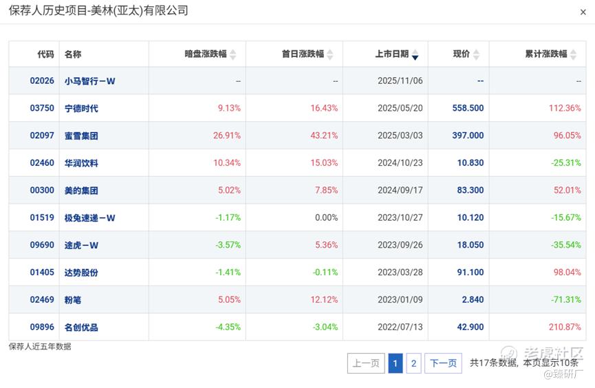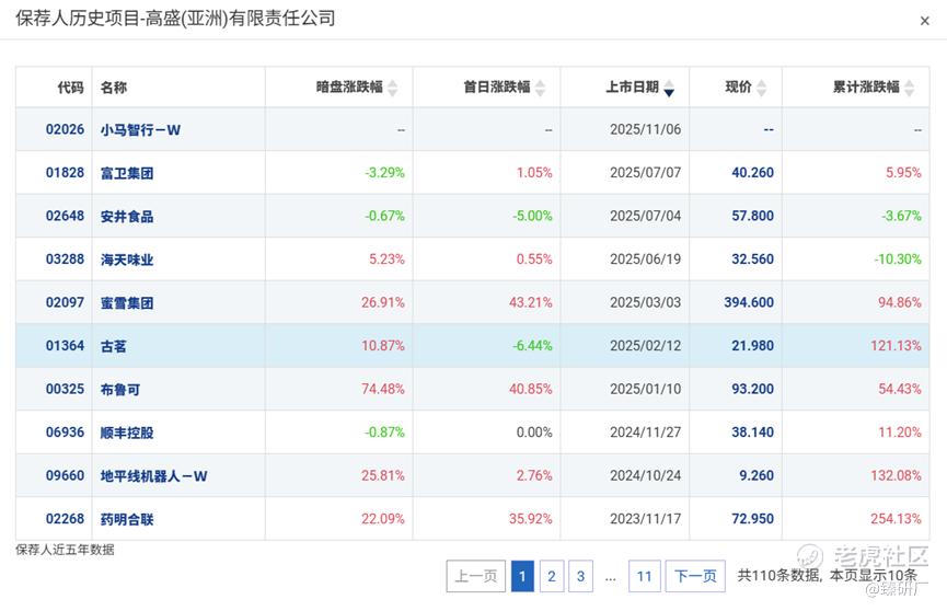 高盛历史上作为保荐人参与了109个项目,其中暗盘有47家公司上涨,36家公司下跌,26家公司平盘,破发率33.03%,首日有57家公司上涨,39家下跌,13家平盘,破发率35.78%,总体胜率还行。近两年来仅参与保荐了9个项目,其中只有2家累计录得跌幅,有5家公司累计涨幅超50%,暗盘或首日的破发也都在10%以内,说明高盛参加的项目本身素质较好,多是当期打新的热门股,加上公司保荐能力优秀,近年来新股表现不错,后续值得期待。