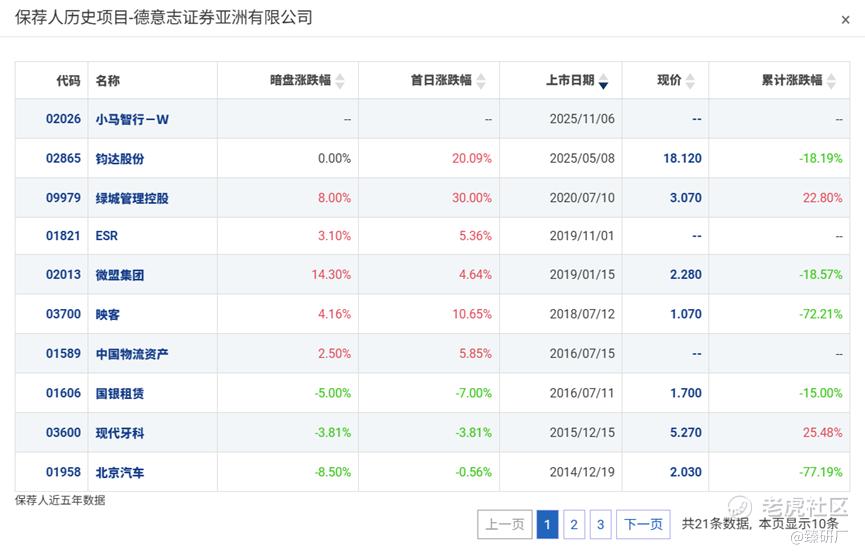 德意志银行历史上作为保荐人参与了20个项目,其中暗盘有6家公司上涨,5家公司下跌,9家公司平盘,破发率25.00%,首日有11家公司上涨,8家下跌,1家平盘,破发率40.00%,总体胜率还行。但是公司近几年只参与了一个项目,因此历史数据的参考价值有限。