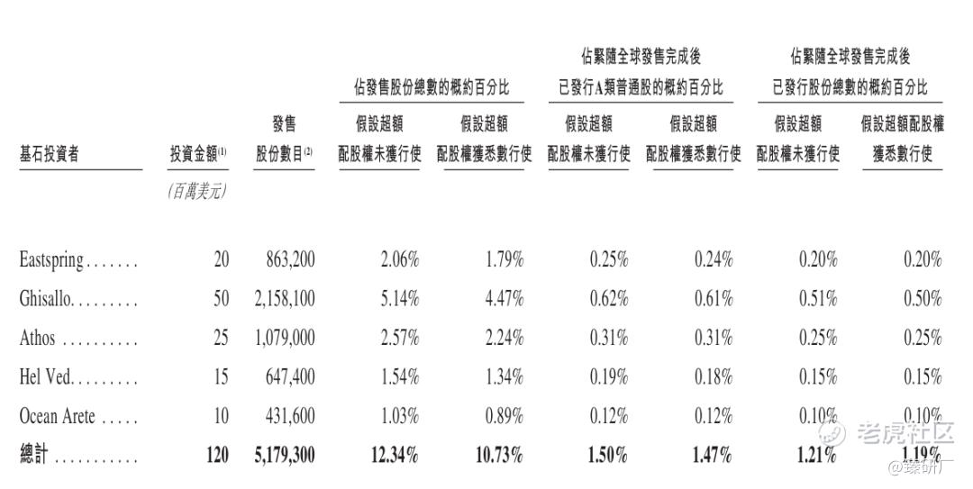 共有5名基石投资者:保诚旗下Eastspring、Athos Capital、Ghisallo、Hel Ved Capital和Ocean Arete,合计认购1.2亿美元,相当于此次全球发售股份的12.34%及紧随全球发售完成后已发行总股份的1.21%(假设超额配售权和发售量调整权均未获行使)。