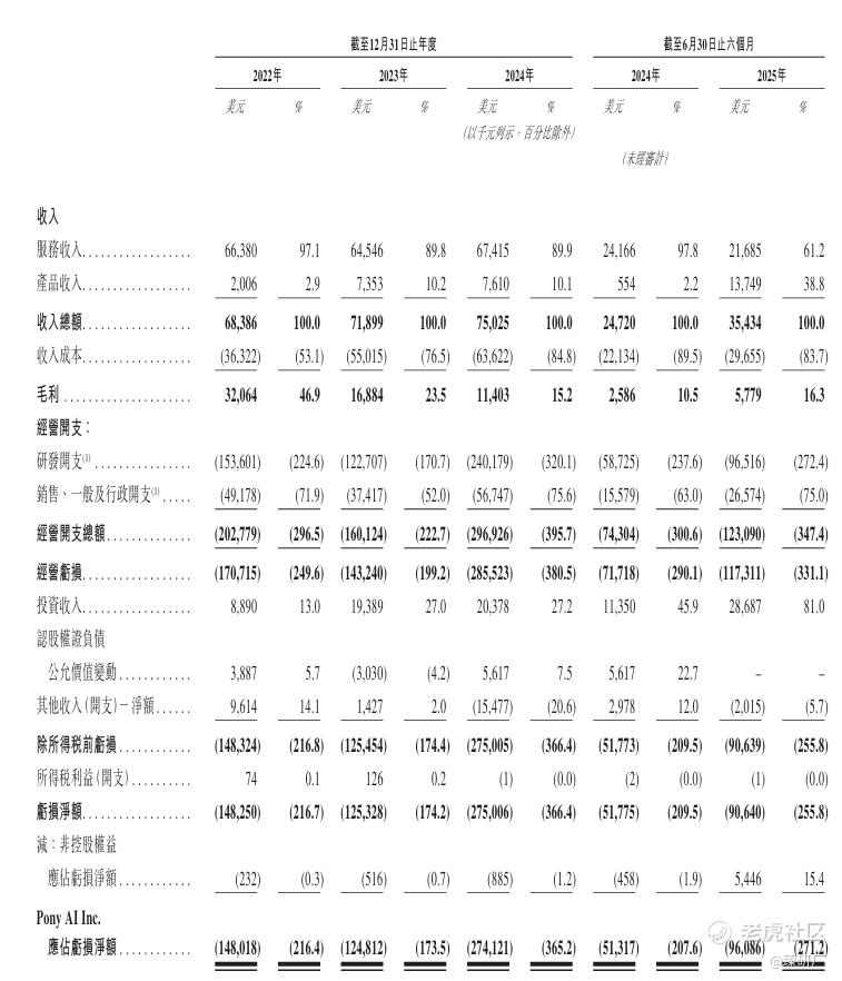 2022年至2025年上半年,小马智行的营收分别为6,838.6万美元、7,189.9万美元、7,502.5万美元、3,543.4万美元,2022年至2024年复合年增长率为4.7%。其中公司收入主要来自技术授权与应用,于报告期内收入占比分别为54.2%、54.5%、36.5%、42.0%,其余来自Robotaxi和Robotruck服务。其中Robotaxi占比稳定在10%附近,Robotruck 2024年收入占比快速增长后维持在50%左右。