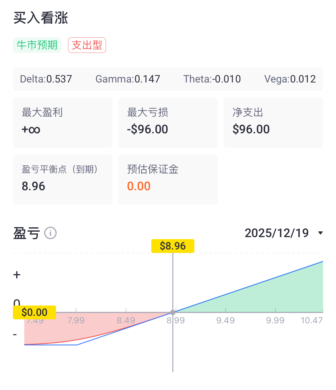 盈亏平衡点:8.96美元(到期股价高于此价则盈利,低于则亏损)。