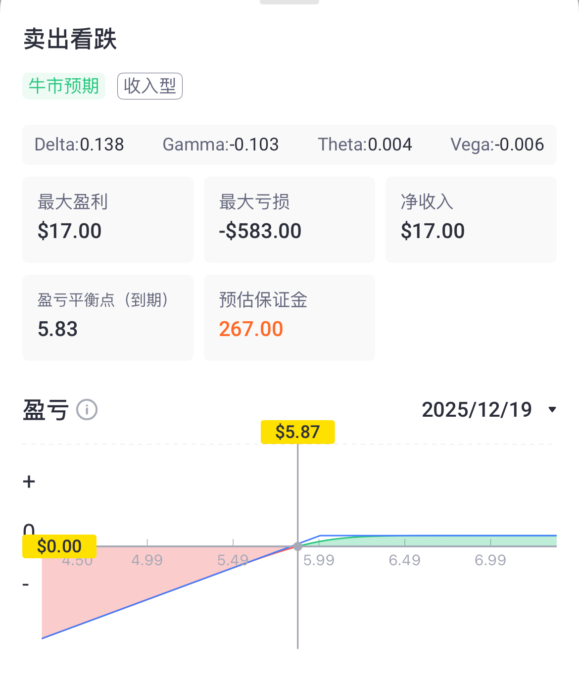 盈亏平衡点:5.83美元(到期股价高于此价则盈利,低于则亏损)。