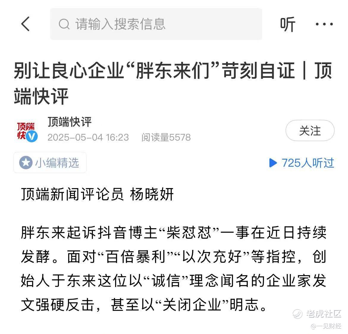 5月4日,河南本地媒体顶端新闻发表《别让良心企业“胖东来们”苛刻自证》一文声援胖东来,点赞了胖东来的诚信经营模式,认为大众需要的是诚信者不必自证、造假者无处遁形的市场环境。