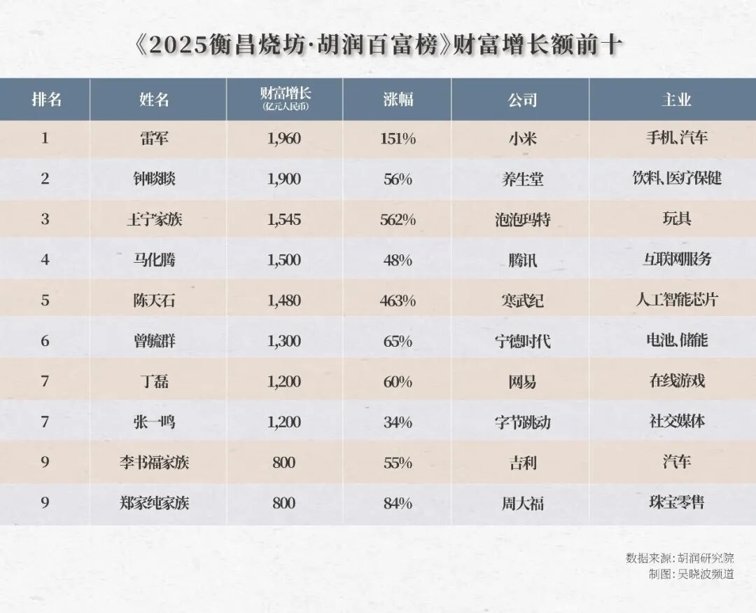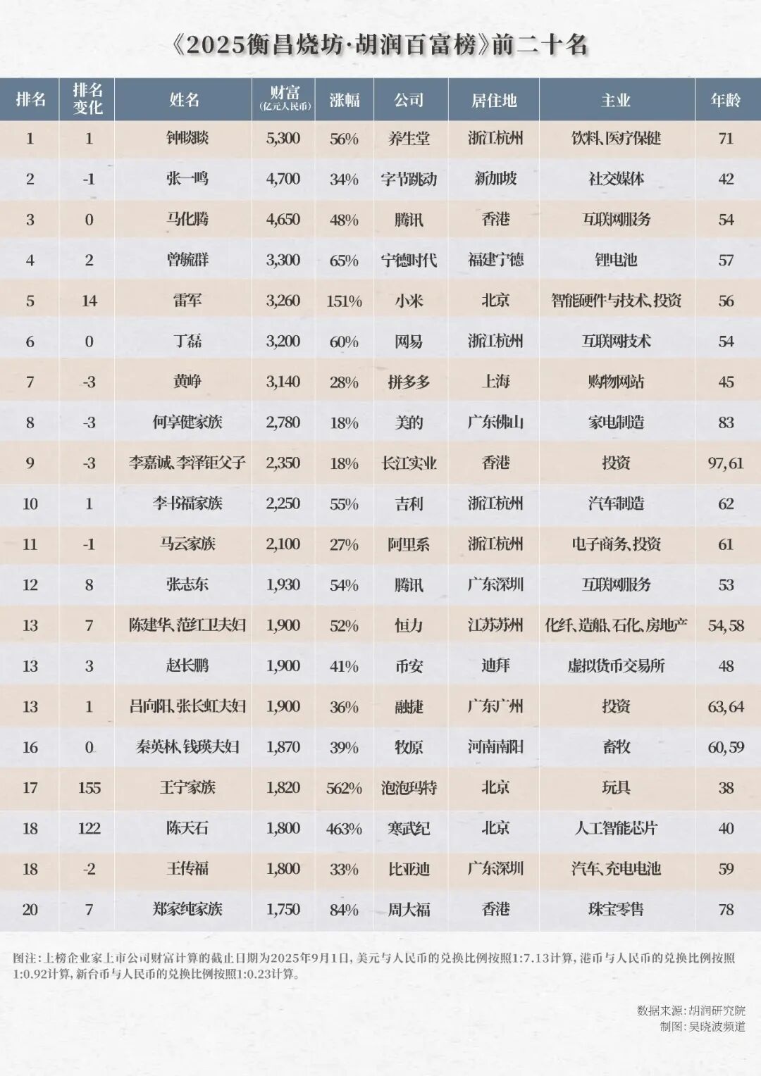 2025年胡润中国富豪榜今天发布。