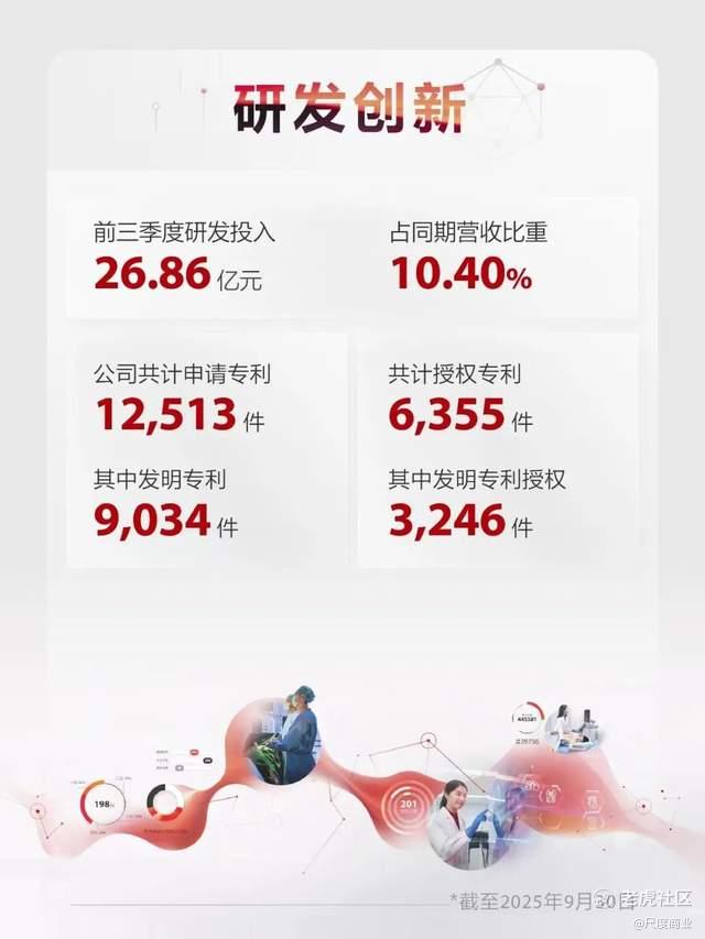 根据三季报披露,迈瑞医疗2025年前三季度继续保持高研发投入,金额26.86亿元,占营业收入比重10.40%,占比同比提高。截至三季度末,公司累计申请专利12513件,其中发明专利9034件;共计授权专利6355件,其中发明专利授权3246件,授权专利总数较上年同期增长792件。