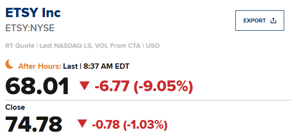 Etsy (ETSY)第三季度每股收益为0.63美元,比市场预期值0.52美元高出0.11美元;营收同比增长2.4%至6.7803亿美元,市场预期值6.5754亿美元。