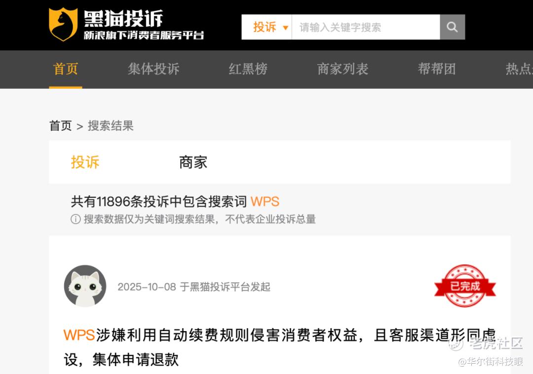 可遗憾的是,作为国内移动办公软件市场占有率超 90% 的龙头,WPS 貌似没能接住这份期待与扶持,在政策为其 “站台” 的同时,黑猫投诉平台却成了 WPS 用户的 “哭墙”,相关投诉已近 1.2 万条,其中 “套娃收费”“权益模糊”“重复扣费” 成为高频词。