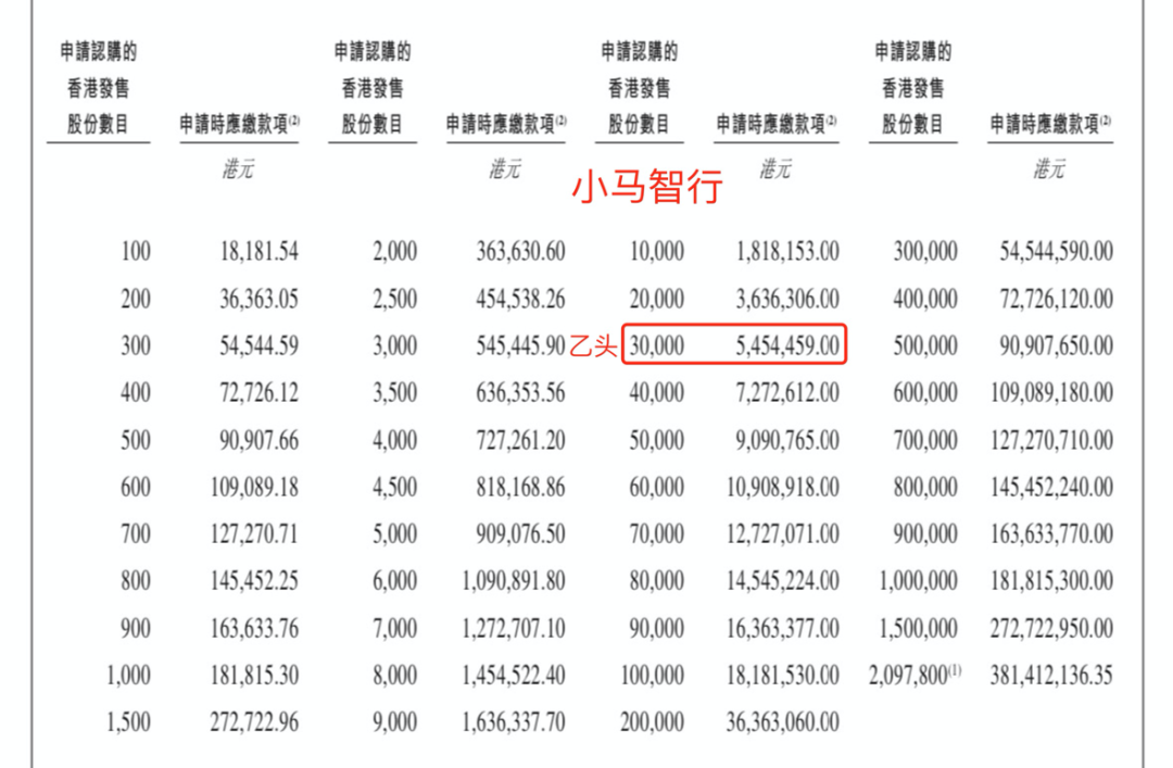参考上一只中概股回港双重上市的禾赛,有9.3万人申购,其中乙组2100人。小马智行乙组按照1500人申购算,预估乙头中签3~5手。