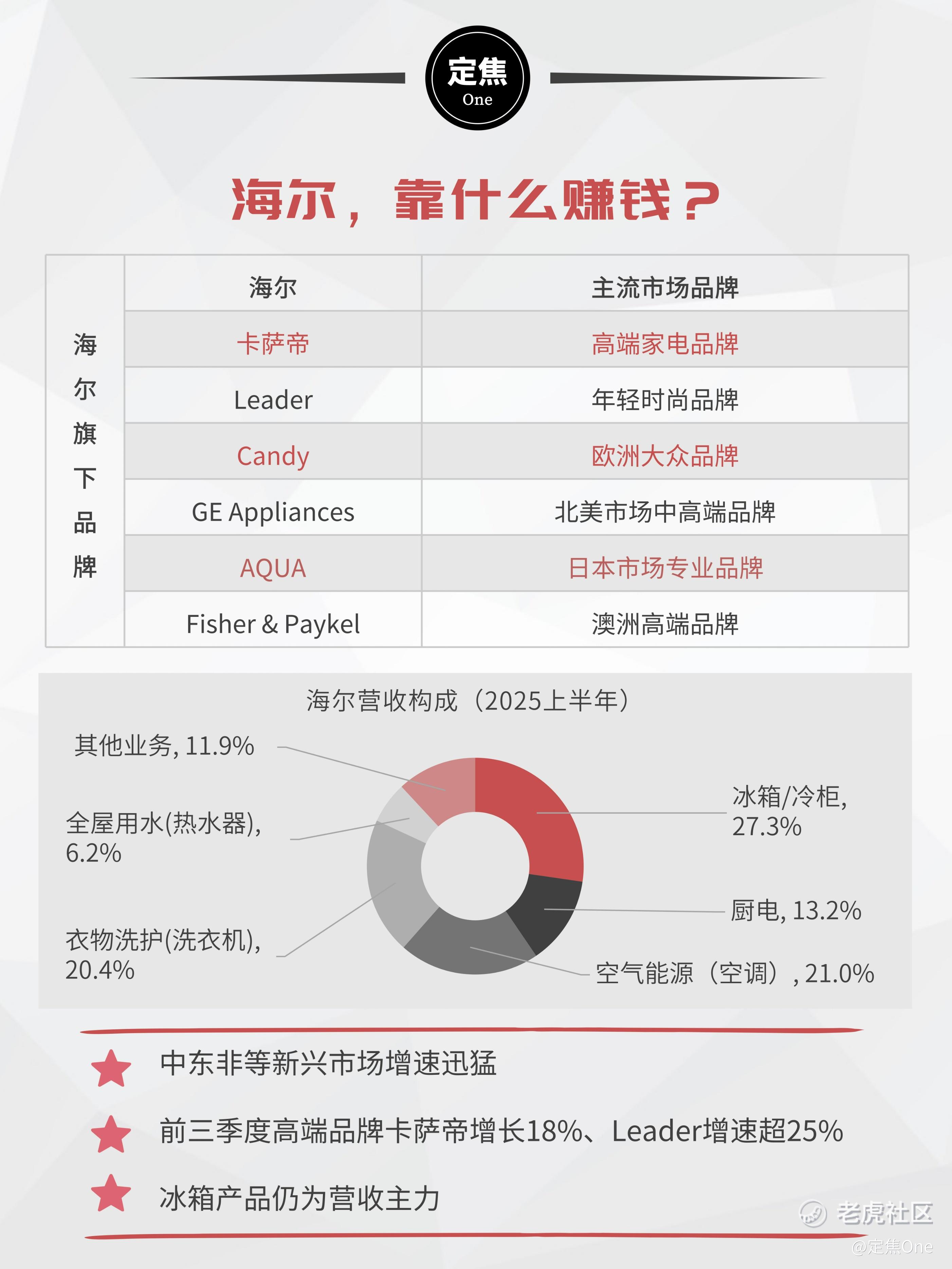 业务端,海尔智家国内市场稳健。前三季度中国区收入增长9.5%,Q3增速升至10.8%,高端品牌卡萨帝增长18%,大众品牌Leader增速超25%。