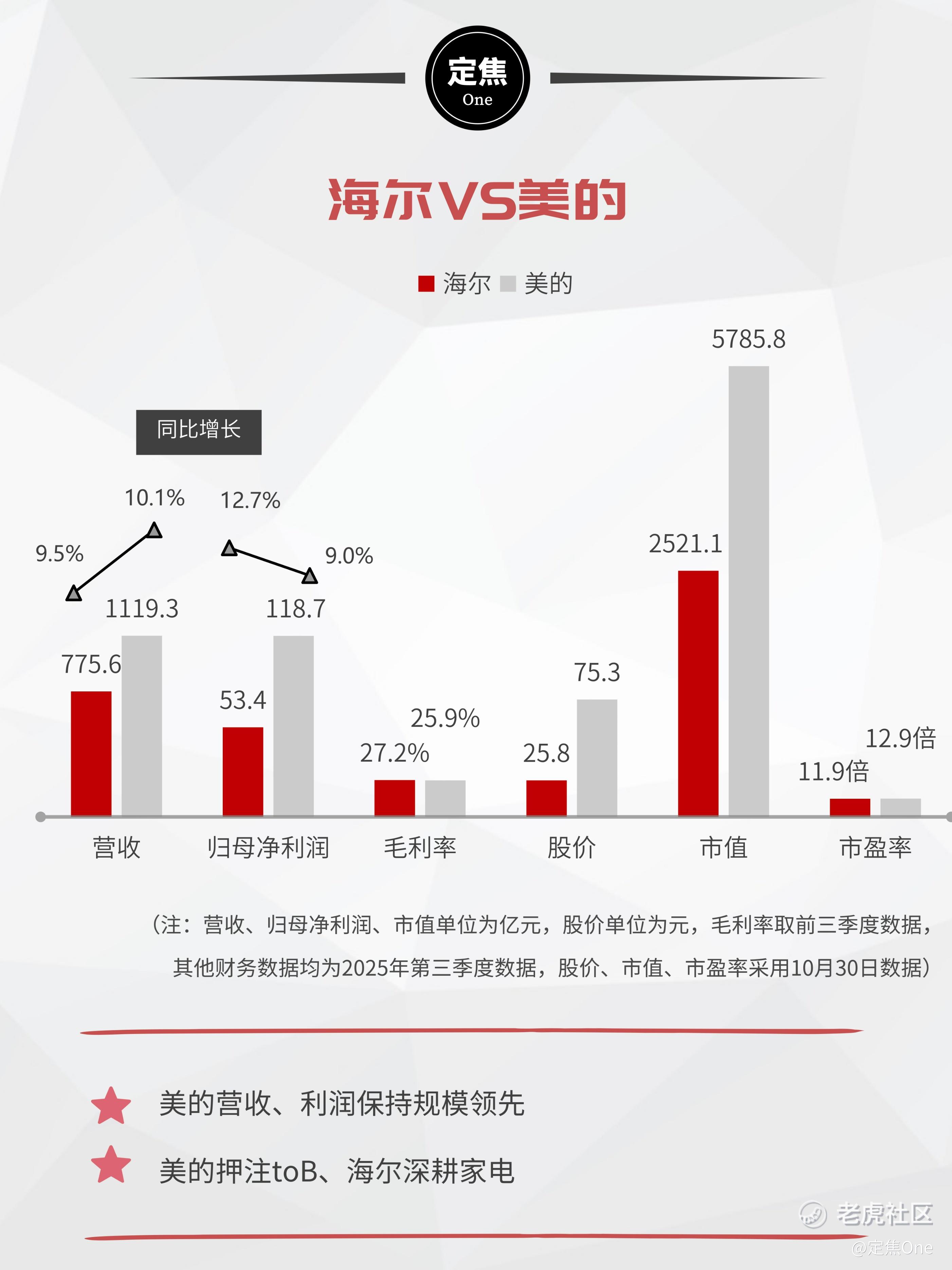 对比美的集团,后者优势明显。前三季度美的营收达3630.6亿元,同比增长13.8%,归母净利润378.8亿元,同比增长19.5%;海尔智家同期营收2340.5亿元、归母净利润173.7亿元,同比增幅分别为10%和14.7%,规模差距源于美的更广泛的业务布局。但单季盈利弹性上海尔更突出,第三季度其归母净利润增速12.7%,远超美的的9%。