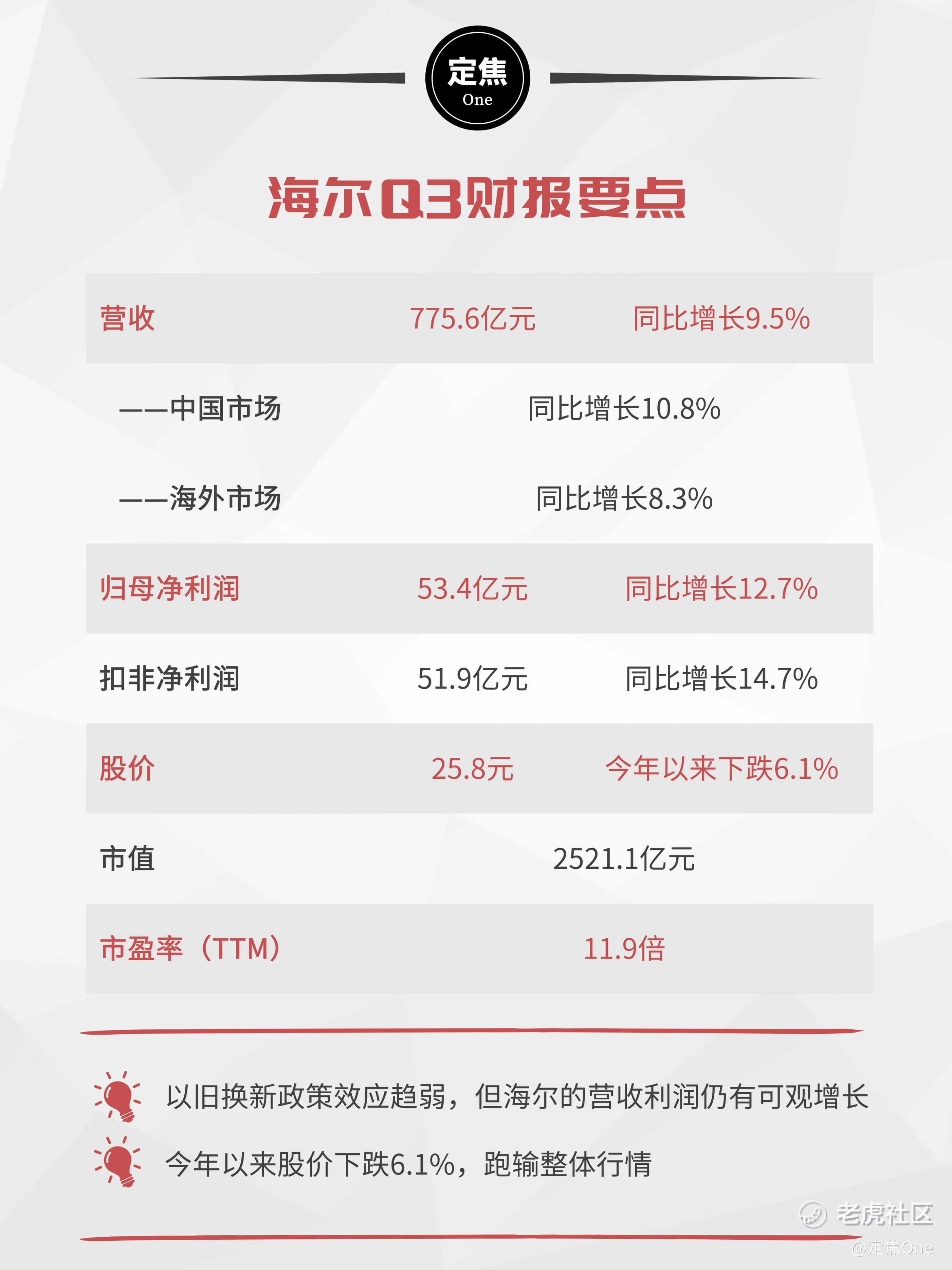 海尔智家前三季度实现营收2340.5亿元,同比增长10%;归母净利润173.7亿元,同比增长14.7%。第三季度单季延续增长态势,营收775.6亿元、归母净利润53.4亿元,同比增幅分别达9.5%和12.7%。