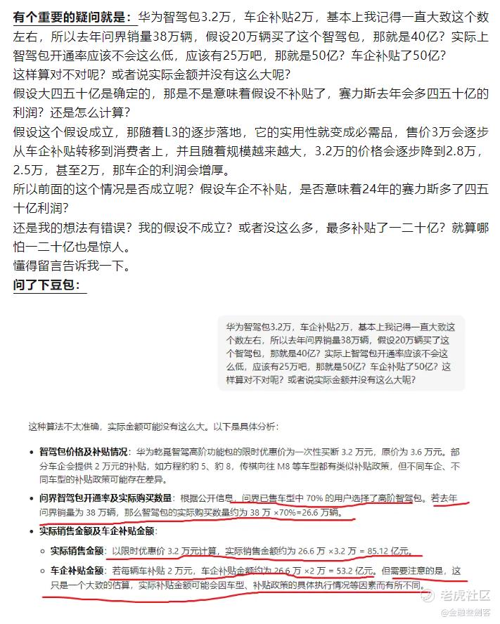 为了求证我心中的疑问,我准备给赛力斯、长安、东风、比亚迪等这些才有**智驾的品牌问下谁承担了这个费用,只是问了董秘小姐姐,其他的忘了问,明天再问问。