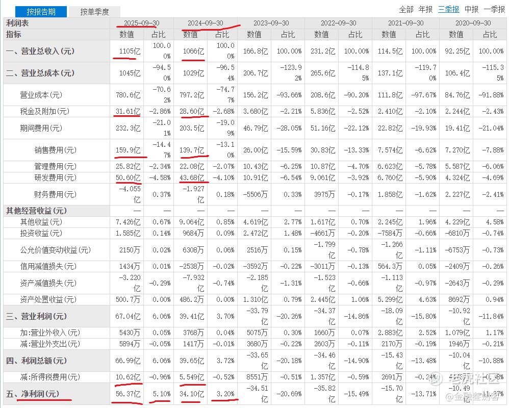 看看税高了3亿,销售费用高了20亿,管理费用多了3.8亿,研发费用多了7亿,所得税费用多了5亿,全部加起来前三季度对比去年前三季度多了38亿!!!如果这部分没有高这么多,是不是多了30多亿利润。只有成熟期的公司才不需要加大投入。成熟期去计算,按照这个营收大致就是53亿+30亿=80多亿