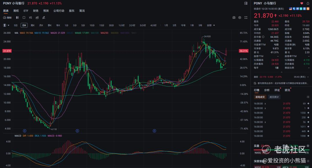 截至2025年10月29日,小马智行美股ADR(PONY)收盘价为21.87美元,对应港股通汇率下的港元价格约为170.33港元(21.87×7.79),而港股IPO发行价上限为180港元,较美股溢价约5.7%。这一溢价水平显著低于港股上市前市场预期的17.7%(以美股前收盘价19.68美元计算),反映出投资者对高估值的谨慎态度。