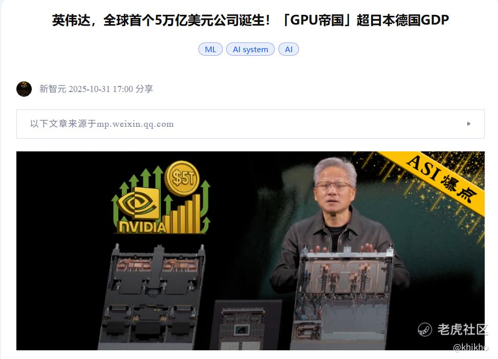 看看英伟达的市值跃升节奏,这简直就是AI时代的加速度!如果从2022年底,ChatGPT横空出世以来,英伟达已经上涨1087%,整整10倍!从1万亿到5万亿,仅用时不到2年,显示出AI产业链的爆发力与英伟达在其中的核心地位。 如果形象一点的说,英伟达的市值超过加密货币市场总规模,超过 英、法、德三国股市总市值!英伟达已不只是科技公司,更像是一个“国家级资产”,其影响力已超越传统金融与地缘边界。