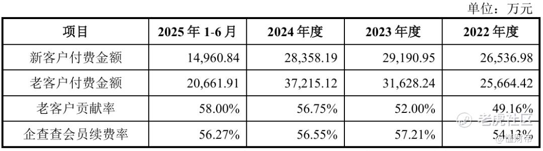 从贡献率来看,企查查多亏了老客户的支持,老客户贡献率从2022年的49.16%涨至2025年6月末的58%。
