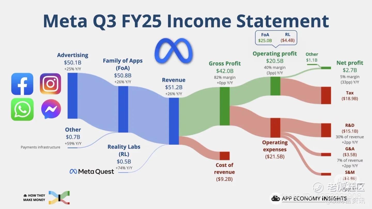 从核心财务数据看,Meta 三季度营收同比增长 26% 至 512.4 亿美元,剔除 159.3 亿美元一次性非现金所得税支出后,净利润达 186.4 亿美元,每股收益 7.25 美元,同比增长 20% 且超市场预期的 6.69 美元。这笔巨额支出并非经营恶化所致,而是特朗普政府 “大而美法案” 引发的会计调整 —— 新法案恢复研发支出立即费用化处理,导致 Meta 此前积累的递延所得税资产部分失效,需进行一次性减值。更关键的是,该政策将为 Meta 带来长期现金税收节约,且四季度有效税率将回归 12%-15% 的正常区间。