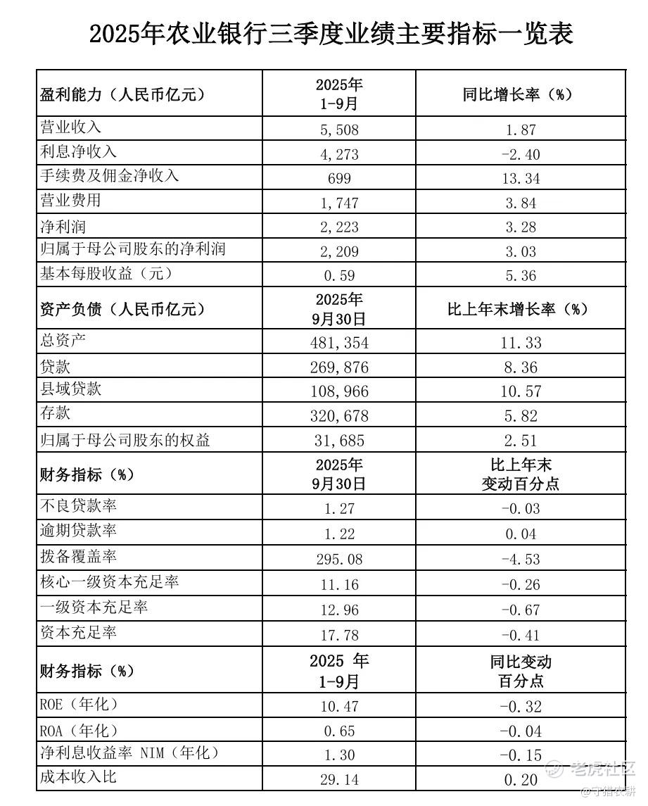农业银行在港交所公告,第三季度营收为1809.81亿元,同比增长4.3%;净利润为813.49亿元,同比增长3.66%。前三季度营收为5507.74亿元,同比增长1.87%;净利润为2208.59亿元,同比增长3.03%。截至2025年9月30日,不良贷款余额3414.04亿元,比上年末增加192.39亿元;不良贷款率1.27%,比上年末下降0.03个百分点。拨备覆盖率295.08%,比上年末下降4.53个百分点