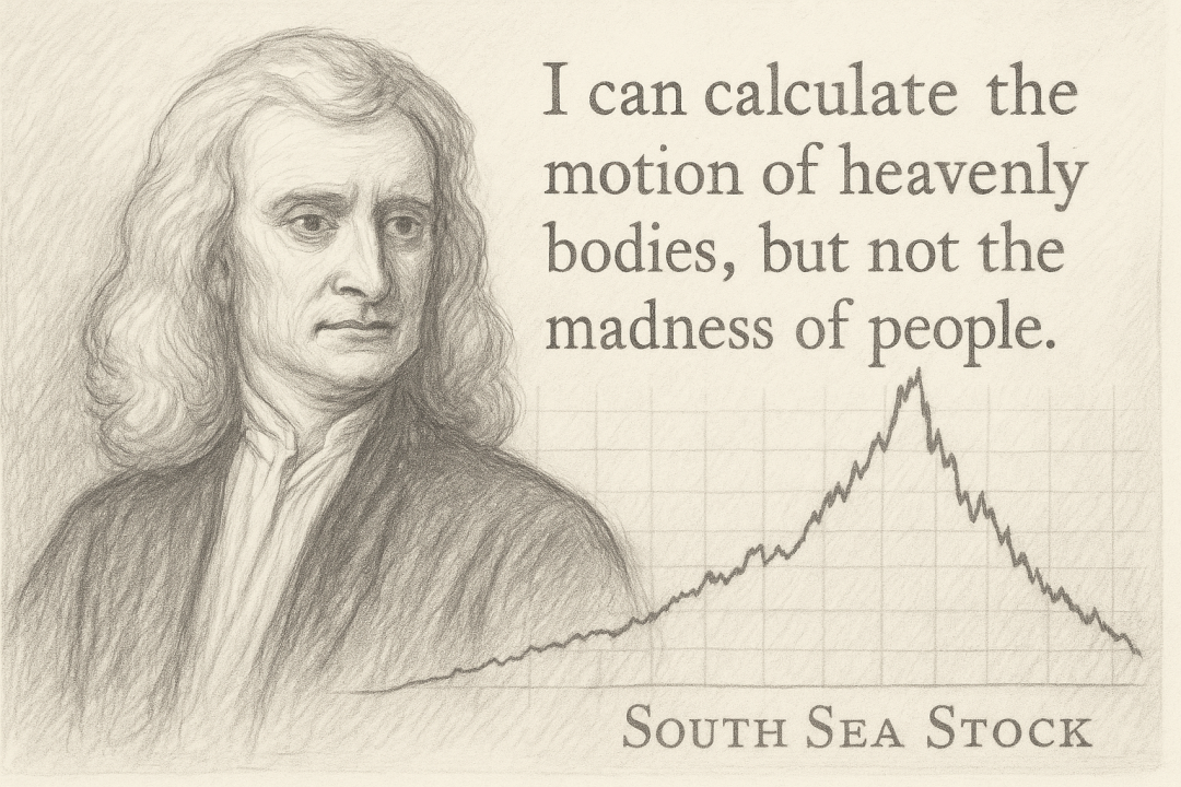 世界上最伟大的科学家之一的牛顿,在南海泡沫破裂后损失惨重。他先是在1720年4月卖出获利一倍,又在5月杀回来重仓追高,9月崩盘时亏损两万英镑,相当于今天的数百万英镑。事后,牛顿留下那句千古名言:“我能计算天体的运行,却无法计算人性的疯狂。”[4]