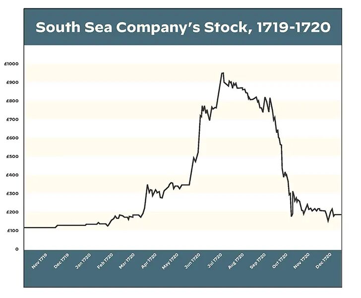 注:1720年上半年,在短短的几个月内,南海公司股价从100英镑飙升至近1000英镑,然后在1720年下半年暴跌。