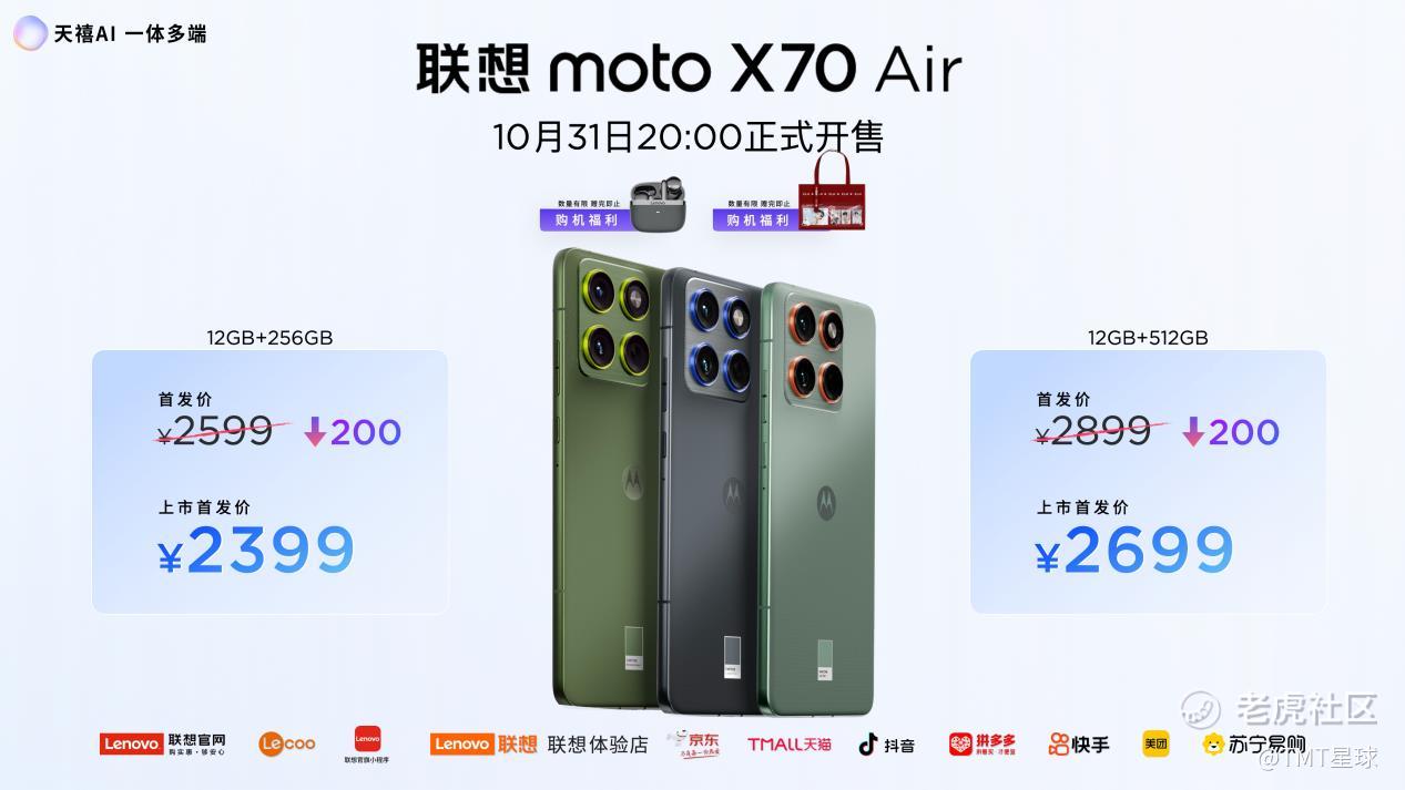 联想moto X70 Air AI手机售价2599元起,10月31日晚8时全渠道正式开售,首销福利限时优惠仅2399元起,还可享国补和平台补贴等多重优惠。